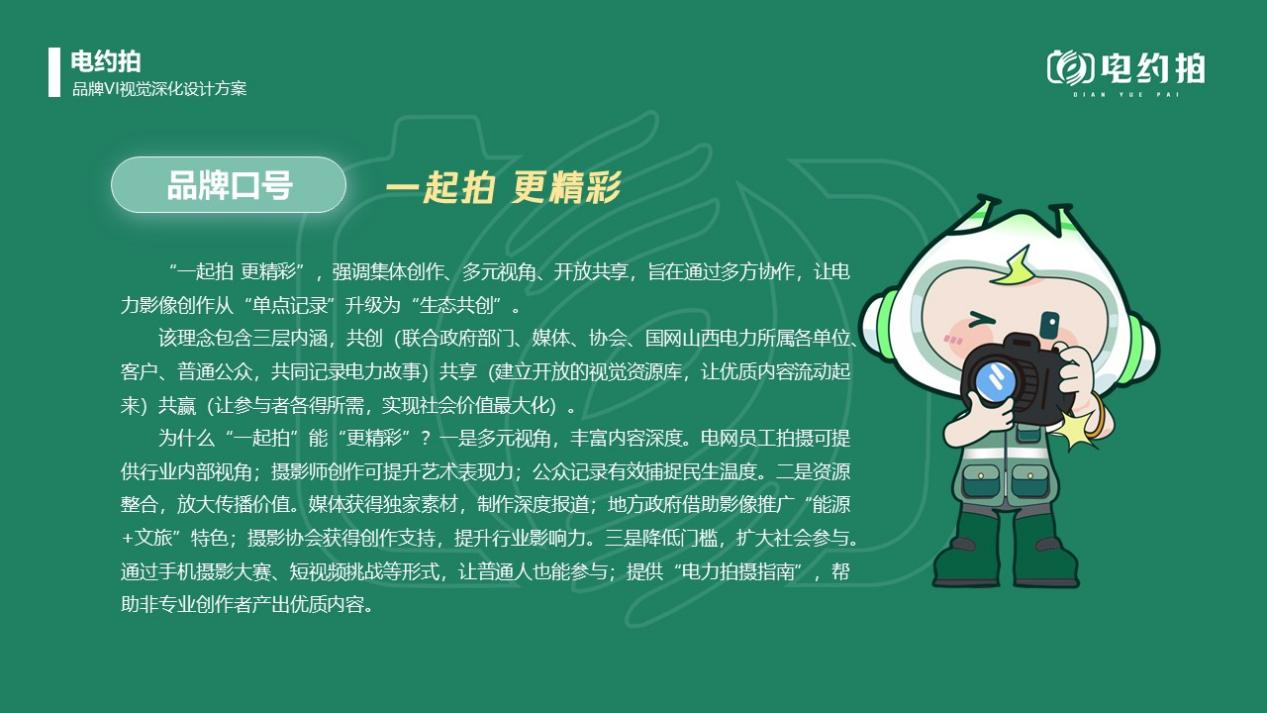 打造“電約拍”品牌,確定品牌定位、理念、愿景、口號(hào)、Logo、任務(wù),完成商標(biāo)注冊(cè),編制品牌手冊(cè),制作文創(chuàng)產(chǎn)品,通過聯(lián)合采風(fēng)、展覽推廣品牌。借助IP人物“晉電小新”影響力,增強(qiáng)作品內(nèi)容吸引力與互動(dòng)性,提升“電約拍”品牌知名度、認(rèn)可度。