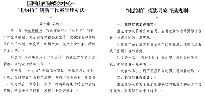 制定《“電約拍”創(chuàng)新工作室管理辦法》《2024年“師帶徒 青藍(lán)計(jì)劃”新聞采訪實(shí)訓(xùn)方案》《圖片資源管理系統(tǒng)管理辦法》《“電約拍”團(tuán)隊(duì)積分獎(jiǎng)勵(lì)辦法》《爭(zhēng)創(chuàng)“七個(gè)最”宣傳成果工作方案》《“為美好生活充電 為美麗中國賦能”攝影月賽評(píng)選規(guī)則》《“電約拍”采風(fēng)承諾書》等相關(guān)制度,通過完善的管理機(jī)制和制度,推進(jìn)了項(xiàng)目規(guī)范化運(yùn)營、標(biāo)準(zhǔn)化管理。加強(qiáng)團(tuán)隊(duì)文化建設(shè),“電約拍——佳片有約”團(tuán)隊(duì)師徒8人,通過附加“葫蘆家族”情愫,打造出“記錄時(shí)代、匠心傳承”的團(tuán)隊(duì)文化。