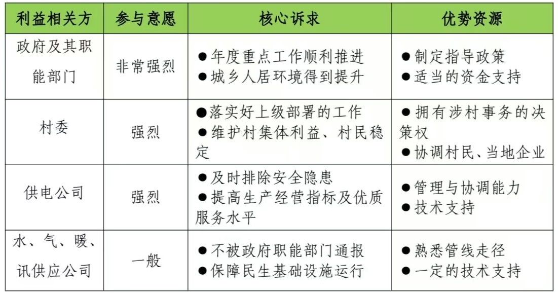 轉(zhuǎn)變以往單打獨(dú)斗的固有工作方式,識(shí)別農(nóng)村配電規(guī)劃建設(shè)有關(guān)的利益相關(guān)方,分析其訴求、資源優(yōu)勢,充分考慮其合理建議、期望和訴求,找到各方利益相關(guān)方的聯(lián)結(jié)點(diǎn),形成“政府主導(dǎo)、供電公司推動(dòng)、水氣暖訊企業(yè)協(xié)同配合、客戶受益、多方共贏”的推進(jìn)模式。