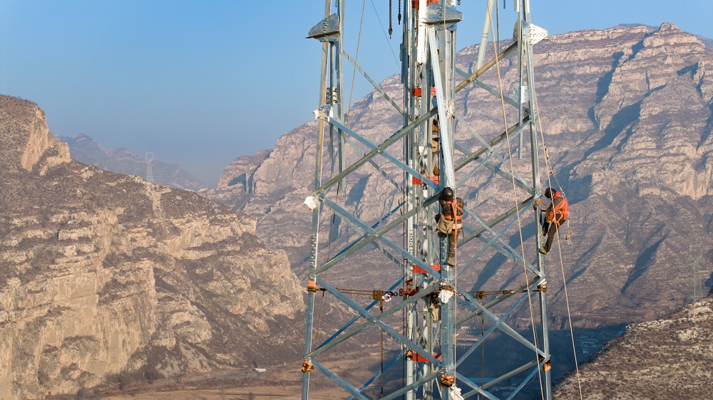 1月1日,國網(wǎng)山西送變電公司施工人員堅守施工現(xiàn)場,在500千伏忻州北-陽泉線路工程開展落地雙搖臂抱桿組塔作業(yè)。